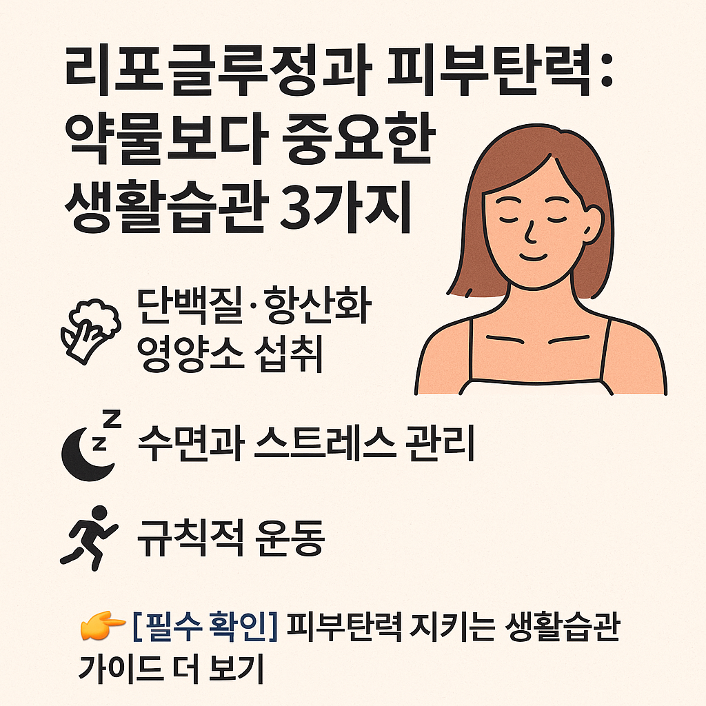 리포글루정은 혈당 관리에 큰 도움을 주고, 피부 노화를 늦추는 데 간접적으로 기여할 수 있습니다. 그러나 피부탄력을 진정으로 지키려면 영양 관리, 충분한 수면, 규칙적인 운동이 반드시 병행되어야 합니다. 이 세 가지 습관은 약물 효과를 배가시키는 동시에, 피부뿐 아니라 전신 건강까지 지켜줍니다. 결국 “피부는 몸 전체의 건강을 비추는 거울”이라는 점을 기억하는 것이 가장 중요합니다.