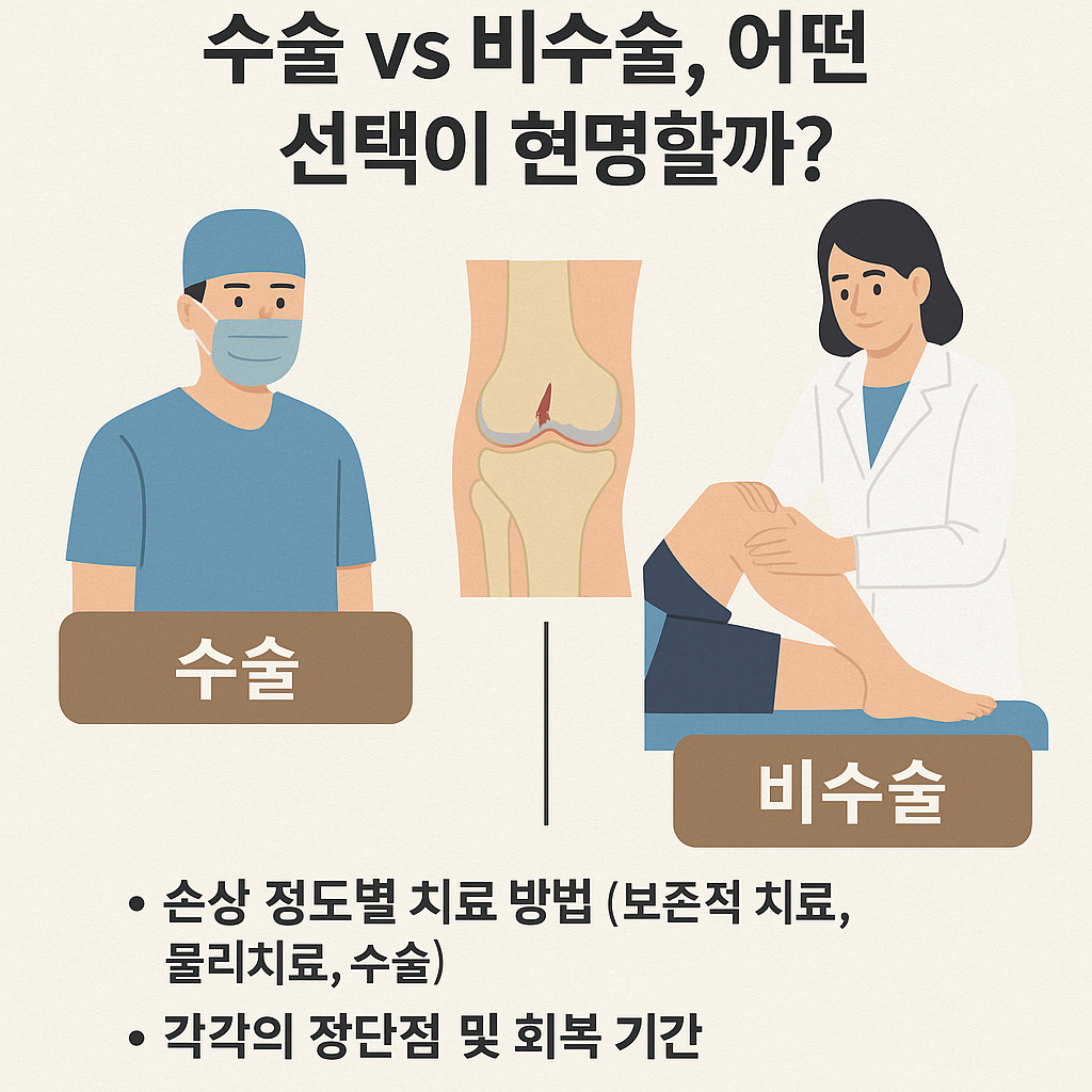 무조건 수술 vs 무조건 비수술의 선택이 아니라, 손상 정도·연령·활동 수준·생활 목표·재활 순응도를 반영한 맞춤형 결정이 정답입니다. 초기엔 보존적·재활치료를 우선하되 통증·기능 저하가 지속되면 수술을 통해 구조적 문제를 해결하는 것이 합리적입니다. 최종 결정 전, 전문의와 충분한 상담으로 내 상황에 맞는 치료 로드맵을 세우세요.
